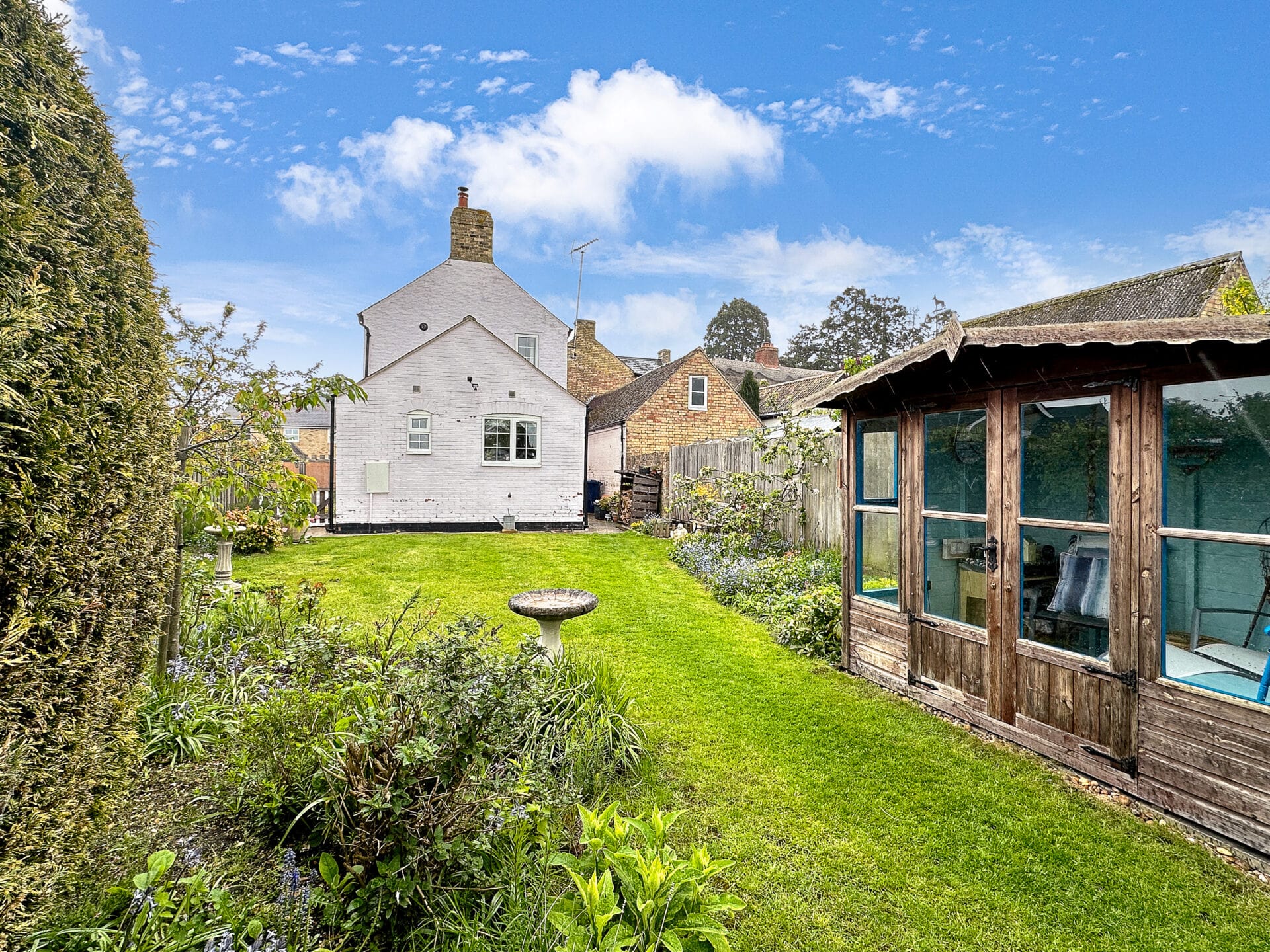 Outside, the property delights with a charming rear garden, primarily laid to lawn and adorned with a variety of flowers, shrubs, and trees. A notably large garage, extending to 18 feet, presents the opportunity for conversion or convenient car storage. Driveway parking for one vehicle is provided, with ample space available for potential extension should the need arise.